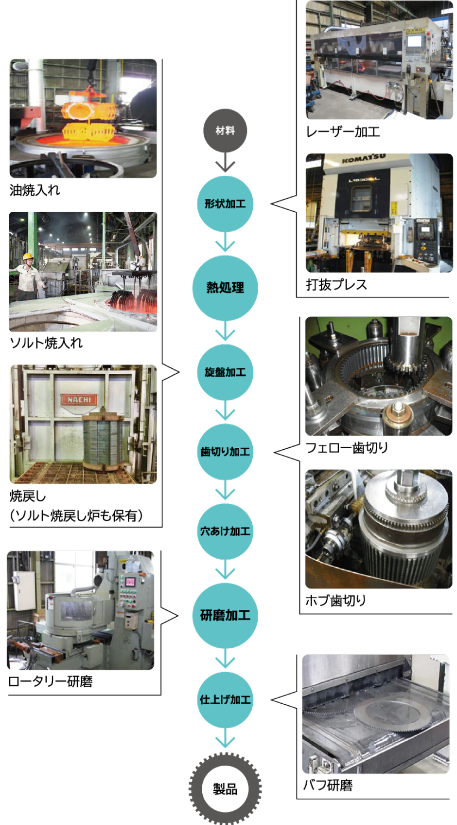 当社では、材料の調達から成形、熱処理、歯切りや研磨、検査にいたるまで一貫して自社の工場で行なう体制を築いています。すべての工程を自社で管理することで、高い製造レベルを維持しながら、安定した品質を確保しています。